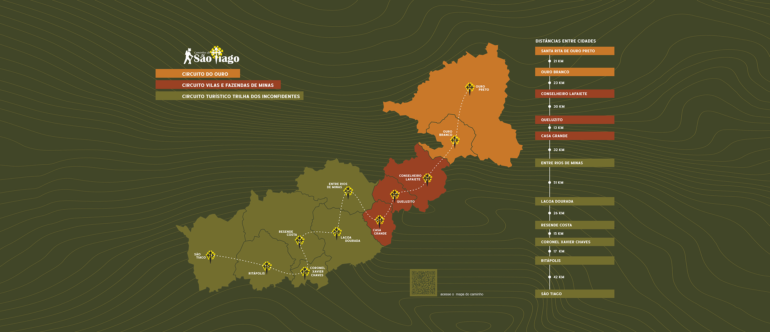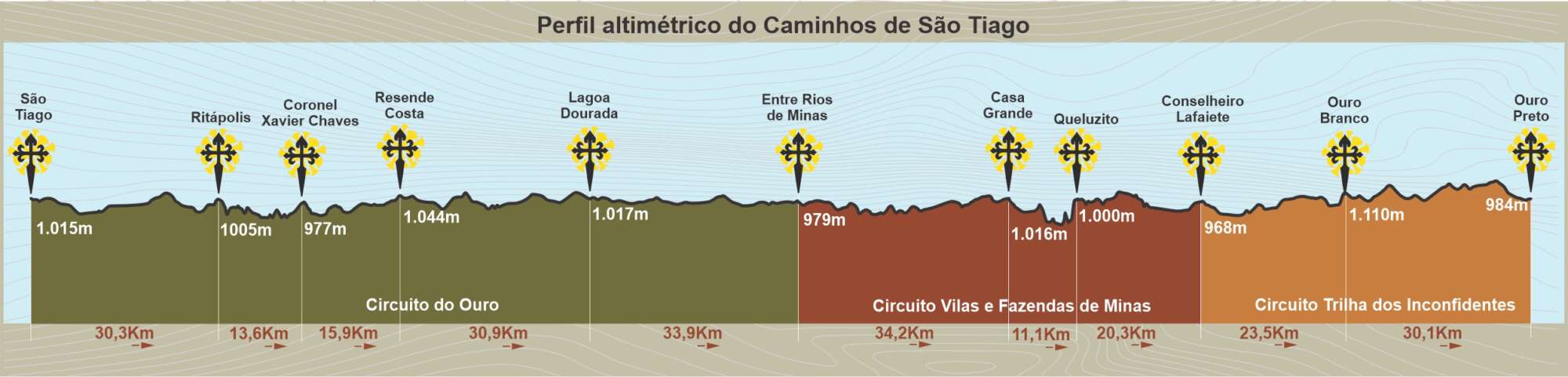 Inspirado nos Caminhos de Santiago de Compostela, na Espanha, o roteiro que parte do município de Ouro Preto com destino a São Tiago promete atrair turistas, fomentar o comércio local e valorizar a cultura e a história das cidades que abrange. Neste sentido, os “Caminhos de São Tiago” propõe levar os turistas para uma volta no tempo, que poderá ser feita como preferir: a pé, de bicicleta, a cavalo, veículo ou moto. Passando pelos municípios de Ouro Preto, Ouro Branco, Conselheiro Lafaiete, Queluzito, Casa Grande, Entre Rios de Minas, Lagoa Dourada, Resende Costa, Coronel Xavier Chaves, Ritápolis e São Tiago. Os trechos foram pensados para atender a diversidade de estratégias que o turista pode utilizar para fazer a rota.